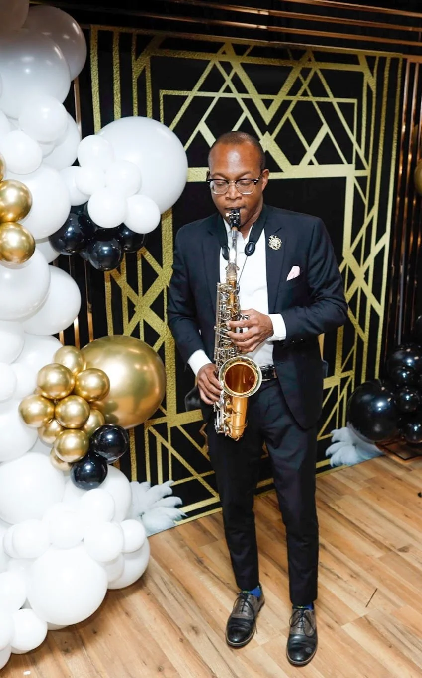 A man in a black suit playing a saxophone at a celebration with black, white, and gold balloons and a black and gold geometric backdrop.