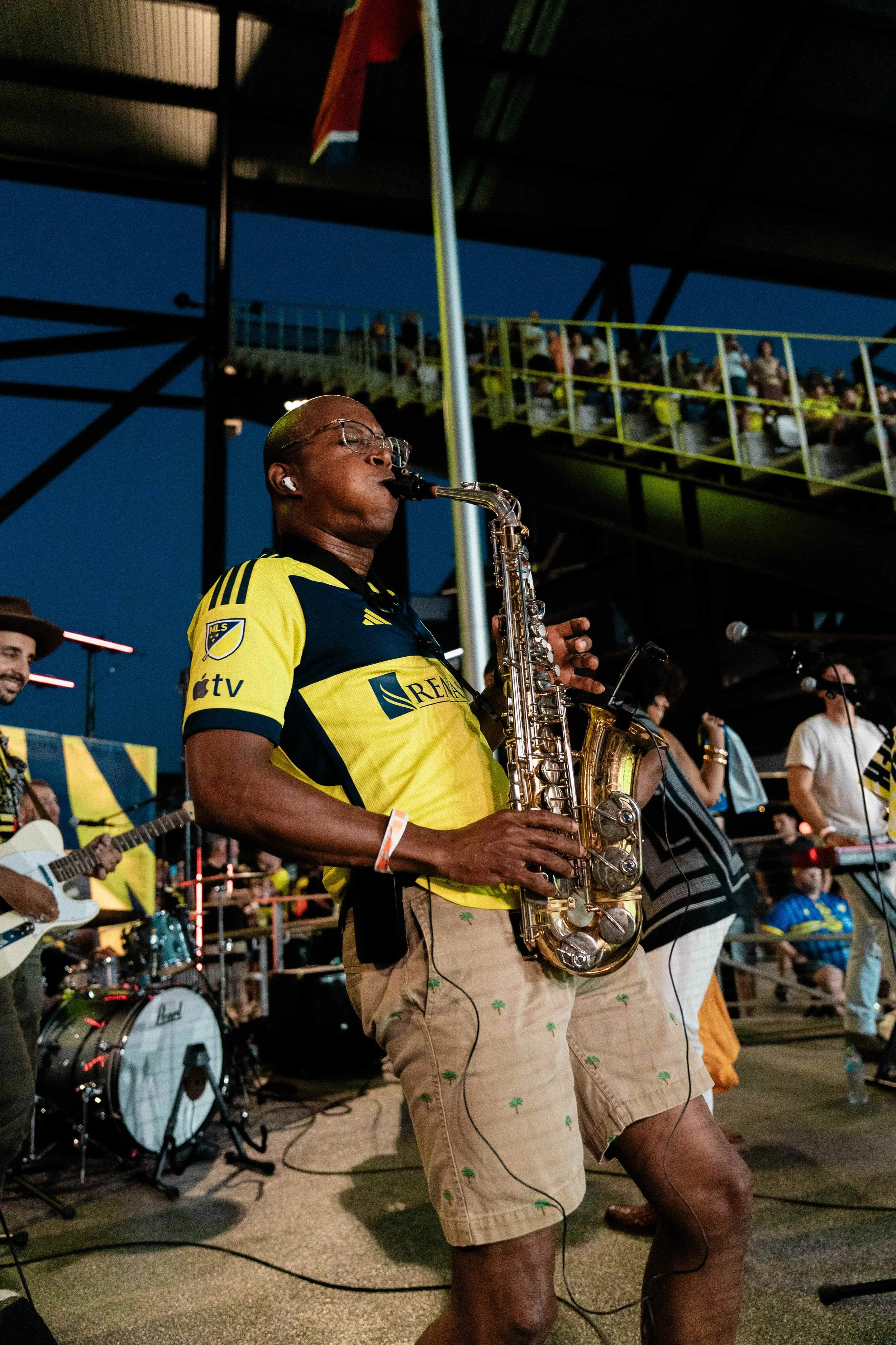 A man playing a saxophone at a concert, wearing a yellow and navy sports jersey, with a band and audience in the background.