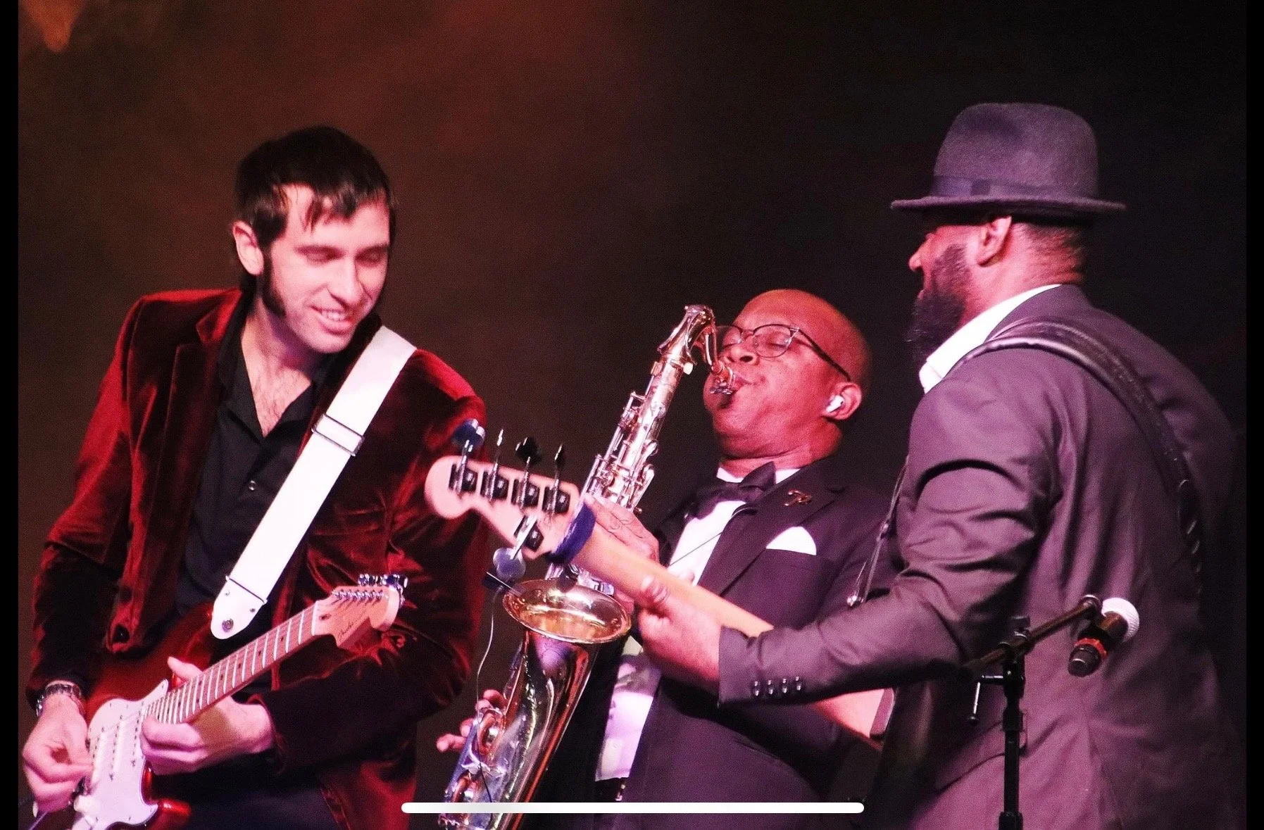 Three musicians performing on stage: a guitarist on the left, a saxophonist in the center, and a guitarist on the right, all wearing formal attire.
