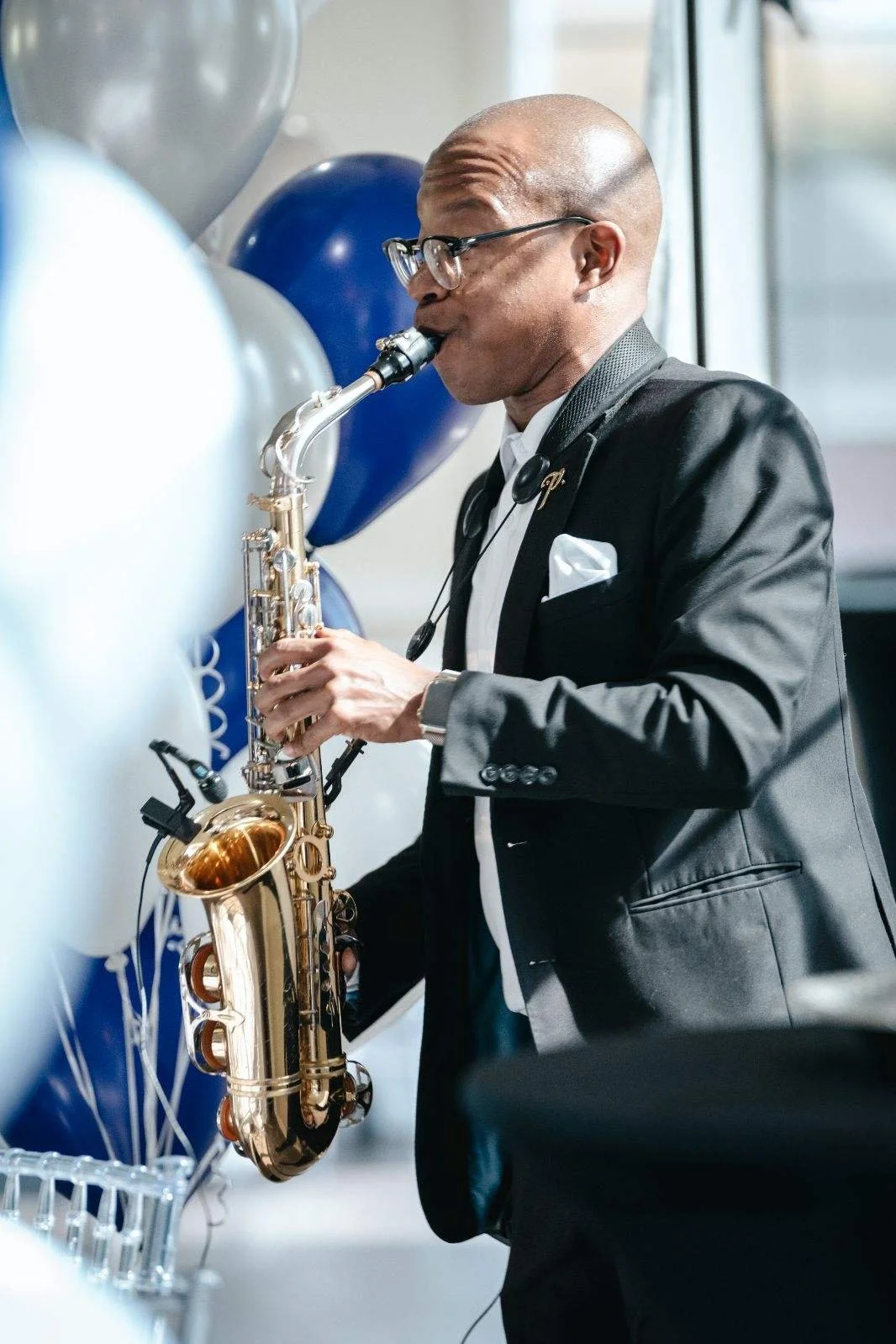 Man in suit playing saxophone at a celebration event with balloons.